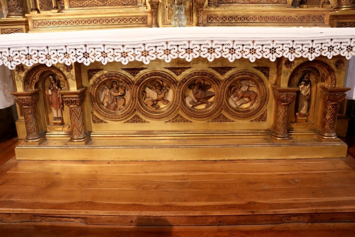 Frente del altar. Un santo en cada hornacina de los extremos y el tetramorfo en el centro.