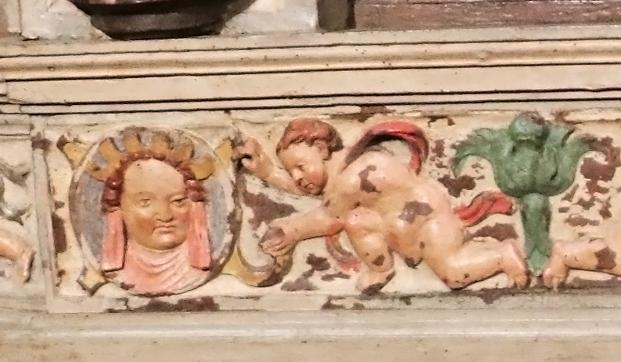 Encima de la hornacina, a modo de entablamento, dos putti con paños volados sostienen una cartela con un rostro femenino.